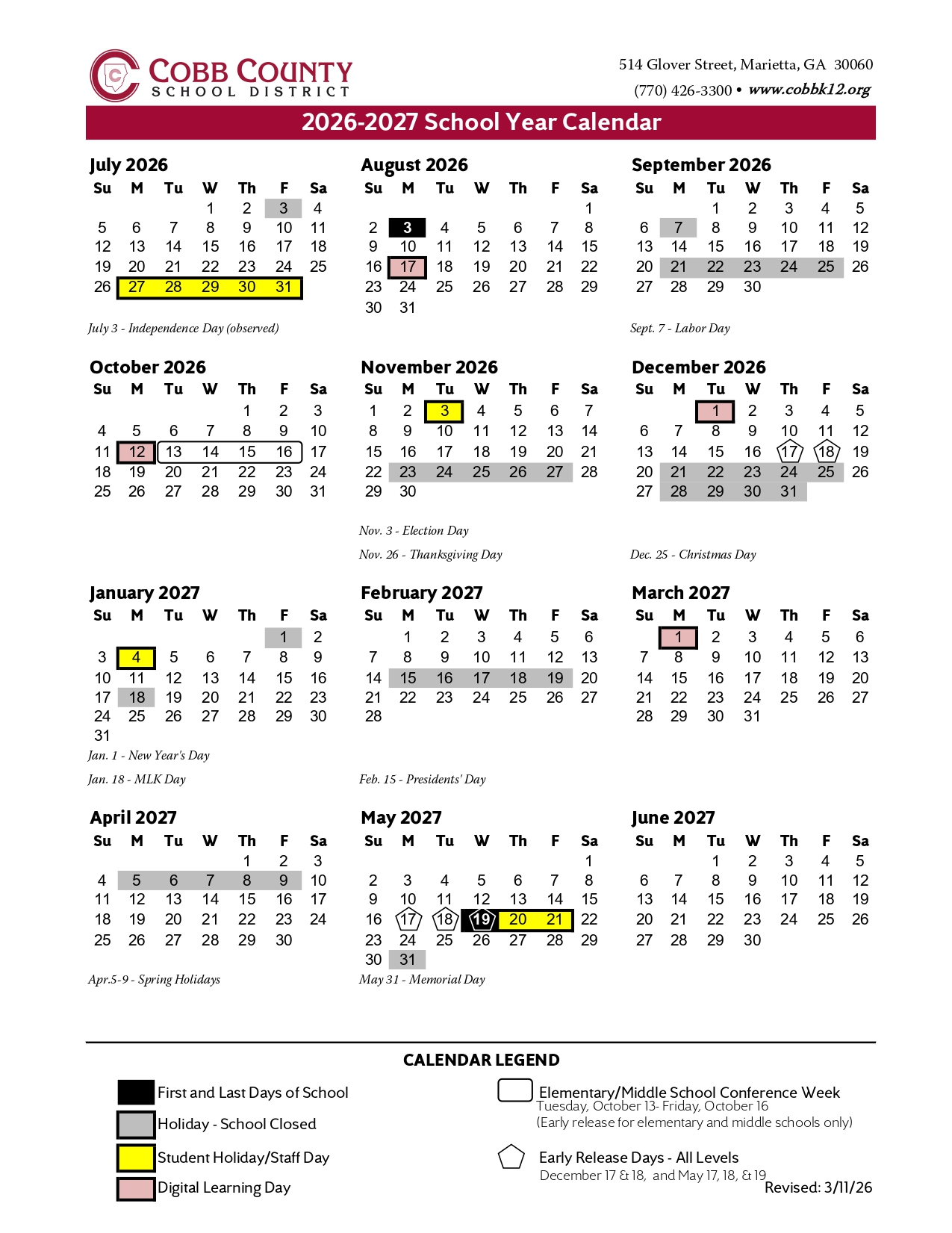 Cobb County Schools District Calendar 2026